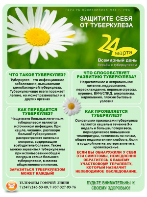 24.03.2020Каждый год 24 марта мы отмечаем Всемирный день борьбы с туберкулезом, цель которого состоит в том, чтобы повысить осведомленность о губительных последствиях туберкулеза для здоровья людей и для общества и информировать об экономических последствиях туберкулеза, и таким образом активизировать усилия по борьбе с глобальной эпидемией этой болезни.