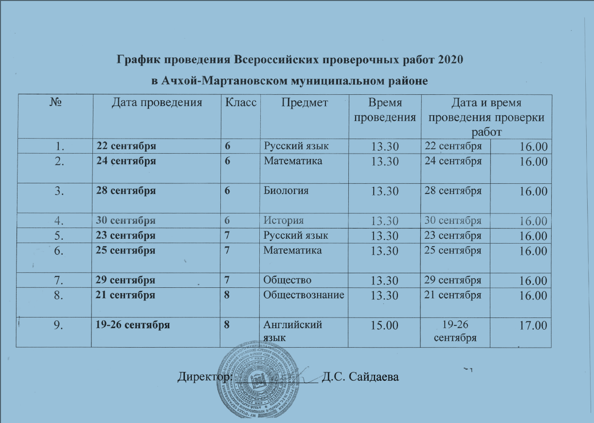 График проведения Всероссийских проверочных работ 2020 в Ачхой-Мартановском муниципальном районе