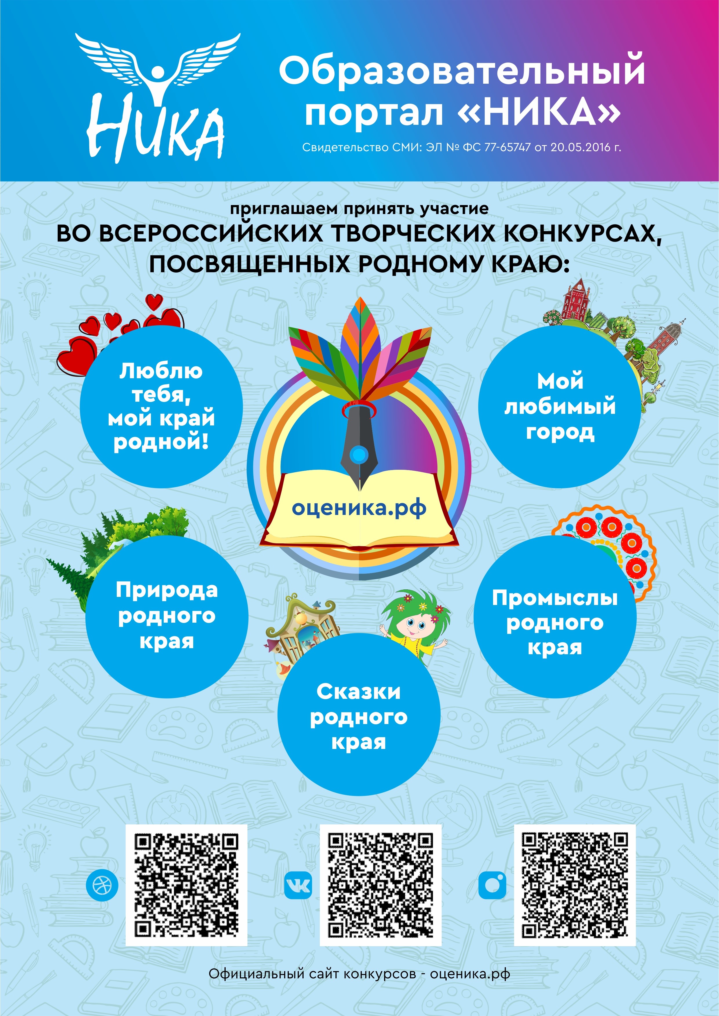 Образовательный портал «НИКА» (оценика.рф), являющийся всероссийским сетевым СМИ (свидетельство Роскомнадзора РФ ЭЛ № ФС 77-65747 от 20.05.2016 г.), предлагает участникам погрузиться в изучение культуры родного края, проявить активный интерес к народным промыслам региона и принять участие во всероссийских дистанционных конкурсах:
