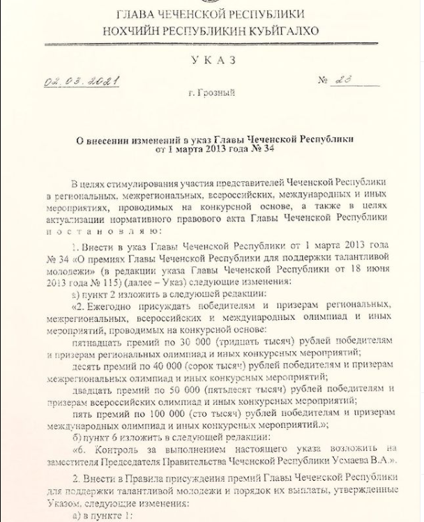 В новом Указе, в целях стимулирования участия представителей Чеченской Республики в региональных, межрегиональных, всероссийских, международных и иных мероприятиях, проводимых на конкурсной основе установлены денежные поощрения победителям конкурсов и олимпиад различного уровня.Так, согласно документу, ежегодно планируется присуждать победителям и призерам региональных, межрегиональных, всероссийских и международных олимпиад и иных мероприятий, проводимых на конкурсной основе:- пятнадцать премий по 30 ООО рублей победителям и призерам региональных олимпиад и иных конкурсных мероприятий;- десять премий по 40 000 рублей победителям и призерам межрегиональных олимпиад и иных конкурсных мероприятий;- двадцать премий по 50 000 рублей победителям и призерам всероссийских олимпиад иных конкурсных мероприятий;- пять премий по 100 000 рублей победителям и призерам международных олимпиад и иных конкурсных мероприятий.».От всего педагогического сообщества ЧР выражаем слова благодарности в адрес Главы ЧР, Героя России Рамзана Ахматовича Кадырова, который уделяет большое внимание системе образования Чеченской Республики и каждым своим решением стимулирует и мотивирует обучающихся и педагогическое сообщество нашей республики.Дала тIаьхье беркате йойла!