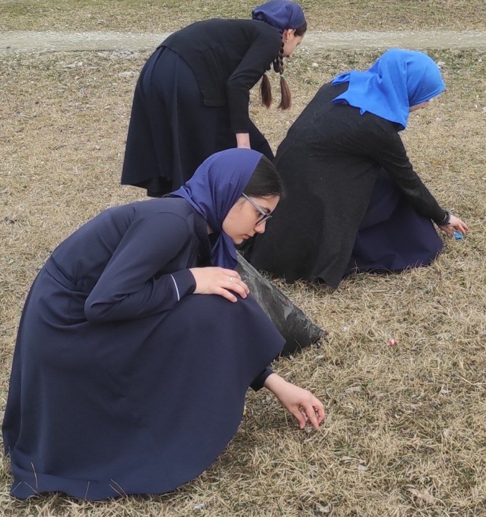Участники субботника с энтузиазмом взялись за работу и соревновались в очистке территории от мусора, дружелюбно поспорив с командой противников. Ребята убирали мусор со школьного двора, убирали территорию вокруг здания, а также очищали цветочные клумбы и газоны от сухих листьев и другого мусора.