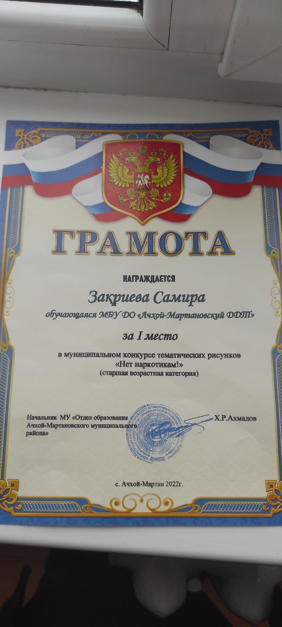 Закриева Самира также заняла первое место в конкурсе рисунков «Скажи нет наркотикам», что продемонстрировало ее приверженность повышению осведомленности об опасностях злоупотребления психоактивными веществами.