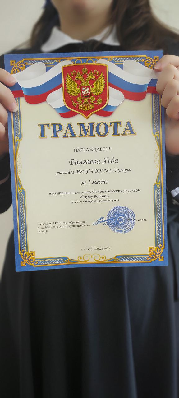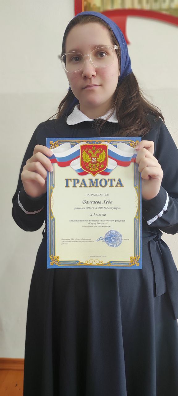 Вангаева Хеда заняла первое место в конкурсе рисунков «Служим России», продемонстрировав свой талант и стремление передать дух страны в своем творчестве.