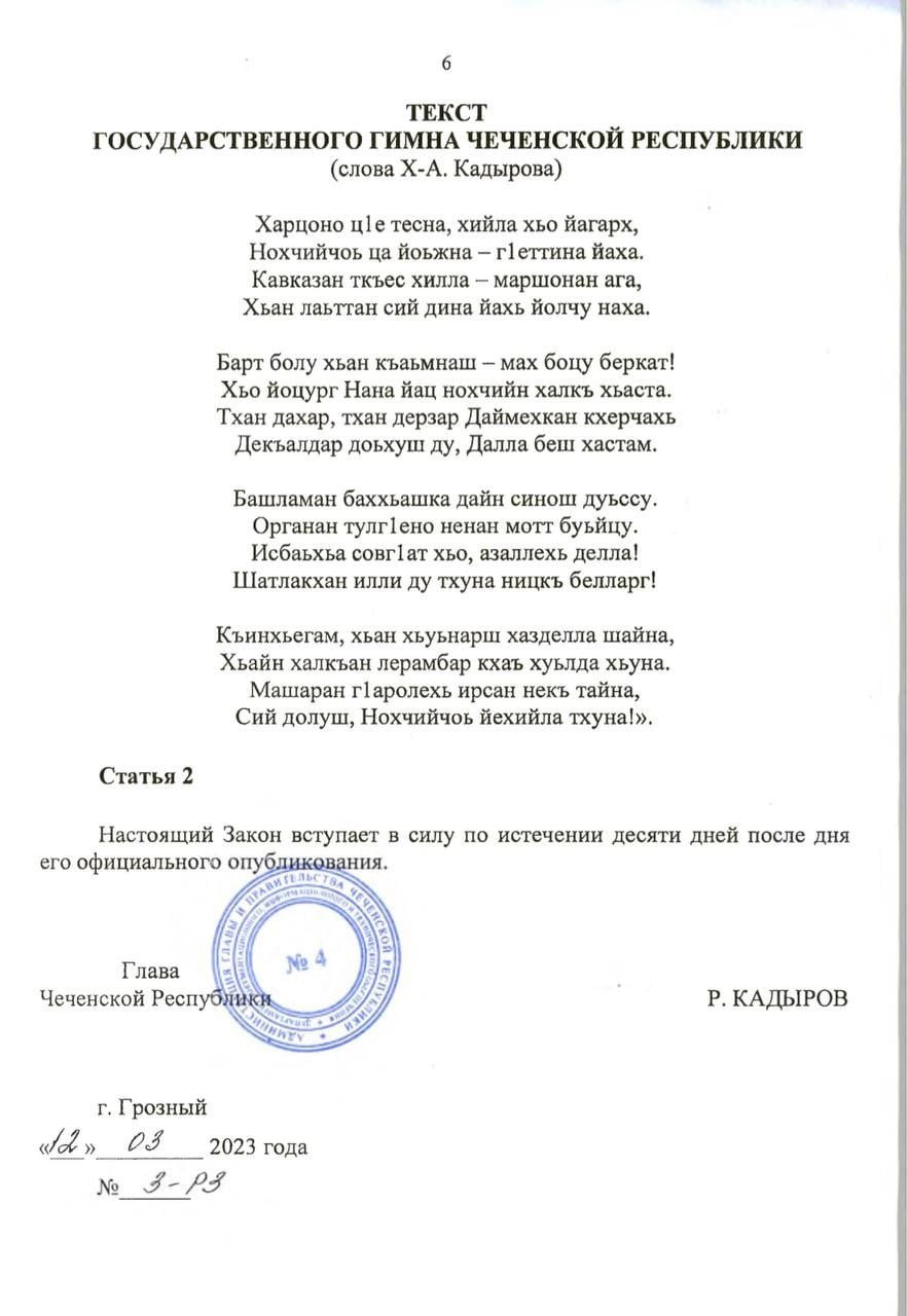 ТЕКСТ ГОСУДАРСТВЕННОГО ГИМНА ЧЕЧЕНСКОЙ РЕСПУБЛИКИ(слова Х-А. Кадырова)