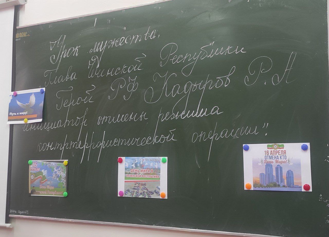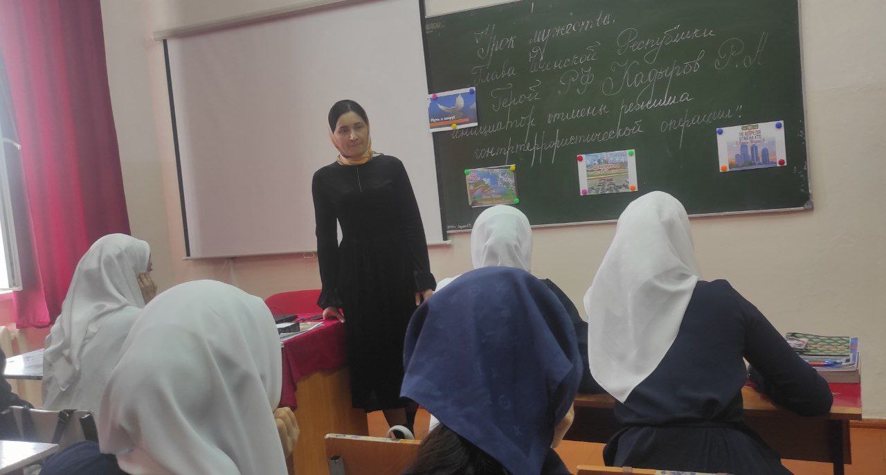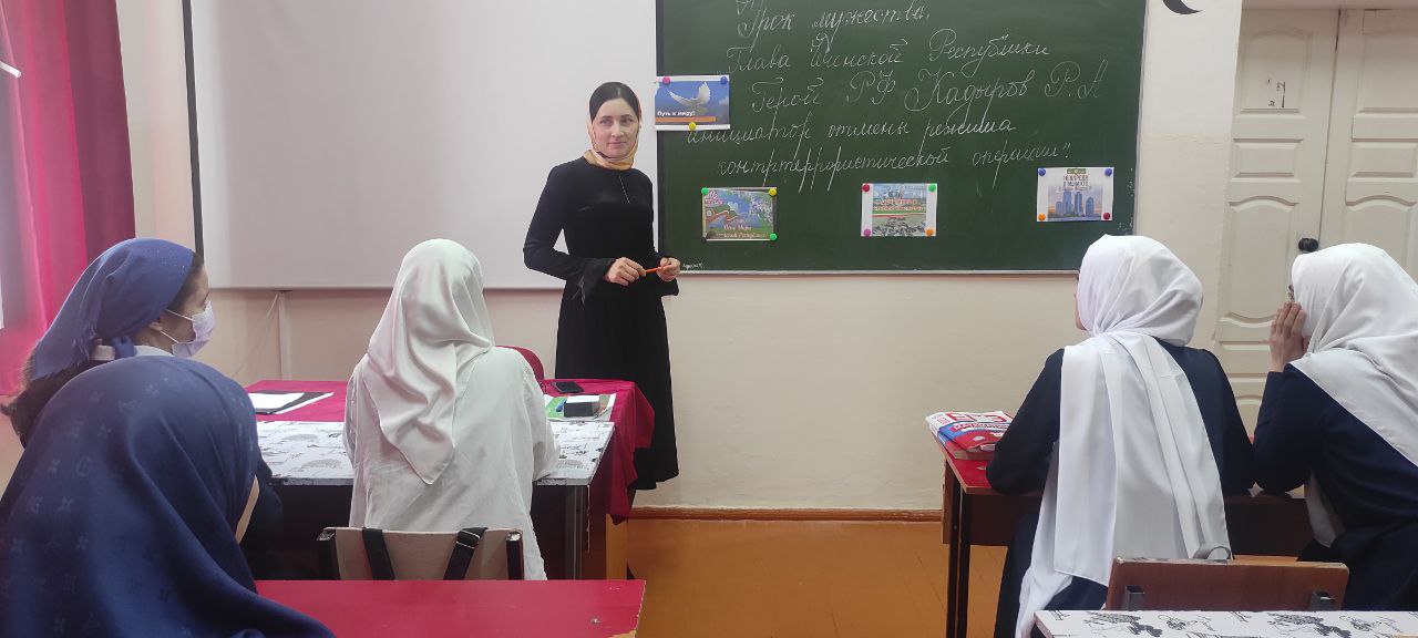 В ходе классных часов в 3 и 4 классах, учащиеся познакомились с историей восстановления мира на территории Чеченской Республики. В свою очередь, ученики старших классов, на уроке мужества, обсудили главу Чеченской Республики, героя Российской Федерации Рамзана Кадырова, который стал инициатором отмены контртеррористической операции.